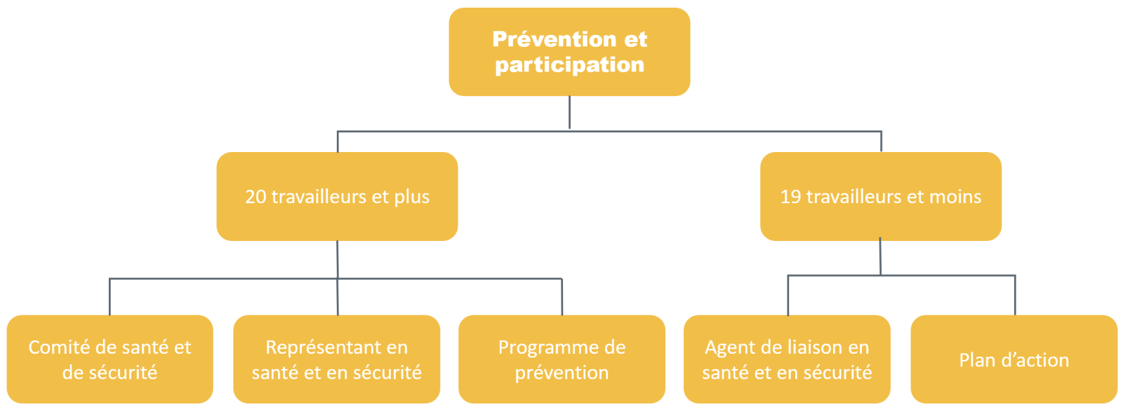 Toute entreprise de 20 travailleurs et plus doit avoir mis en place un comité de santé et de sécurité dont la moitié des membres représentent les travailleurs. Le nombre de représentants des travailleurs est déterminé par entente entre l’employeur et les travailleurs de l’établissement. À défaut d’entente, ce nombre est celui défini par le Règlement sur les mécanismes de prévention et de participation en établissement (art. 7). Les règles de fonctionnement du comité de santé et de sécurité, incluant la fréquence minimale des réunions, sont déterminées par entente entre ses membres. À défaut d’entente, les règles déterminées par le Règlement sur les mécanismes de prévention et de participation en établissement s’appliquent (art. 17 à 30). Pour bien comprendre le rôle, les fonctions et le mode de désignation du comité de santé et de sécurité, visionnez la capsule vidéo de la CNESST (6 :31 min) Fonctions d’un comité de santé et de sécuritéLes principales fonctions du comité de santé et de sécurité sont de :